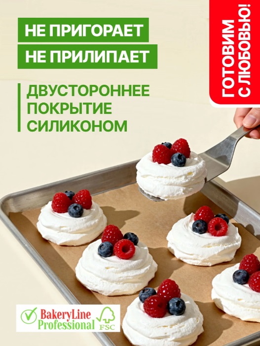 Бумага для выпечки с двусторонней силиконизацией. Не требует смазывания жиром или маргарином, продукты не пригорают и прекрасно отходят от рабочих поверхностей. Характеризуется высокой степенью жиро- и влагостойкости. Не содержит канцерогенов.