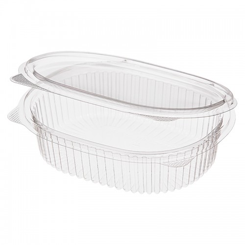Салатник РКС-350 (СП) типа «ракушка» с несъемной крышкой овальной формы выполнен из двуосно-ориентированного полистирола ПЭТ, цвет прозрачный. Замок «П» образный, герметичный, на крышке и корпусе есть «ушки» - для удобства открывания. Контейнер применяется для расфасовки и упаковки холодных блюд, салатов, орехов, сухофруктов. Не разогревать в микроволновке.
