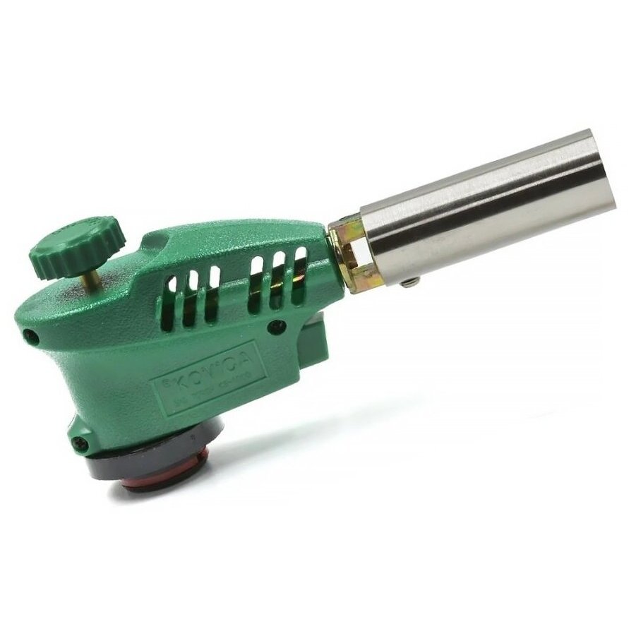 Газовая горелка Kovica KS-1005 (Зеленый). Эта портативная газовая горелка оснащена пьезоподжигом, который встроен в курок горелки. Она создает устойчивое пламя с температурой около 1300-1400 градусов Цельсия, которое не подвержено воздействию ветра и дождя. Для зажигания пламени достаточно одного нажатия кнопки, благодаря пьезоподжигу. Мощность пламени можно регулировать вручную путем увеличения (on) или уменьшения (off) газового потока. Энергоносителем для этой газовой горелки служит обычный газовый баллон с кольцом-держателем. Однако стоит отметить, что баллон с газом не входит в комплект, его вы можее приобрести отдельно, арт. 00005178.