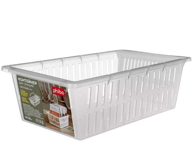 Контейнер для специй - прекрасное решение вопроса хранения пакетиков со специями на кухне и не только. Оптимальные габариты для удобного размещения в самых распространенных шкафах. Чистое хранение – дно контейнера не позволяет специям упасть в шкаф или на стол. Съемные перегородки для составления отсеков нужного размера. Специальный удобный паз для хранения неиспользуемых перегородок. Малый вес и компактность делают контейнер отличным выбором для любой хозяйки. Контейнер легко моется. Изготовлен из безопасного материала.
