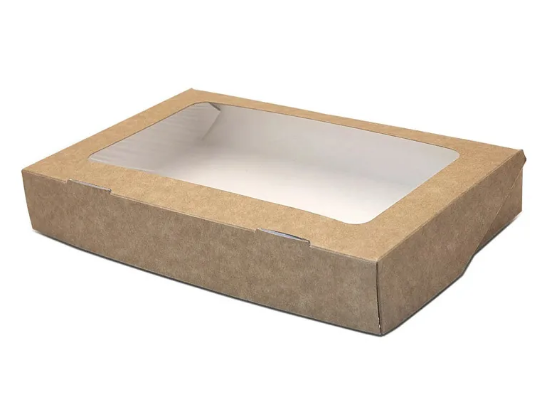 Контейнер бумажный с окном жиро- и влагостойкий, с внутренней ламинацией.Этот универсальный контейнер из крафт-картона пригодится для подачи холодных и горячих блюд на вынос. Область его применения очень широка. В такие одноразовые контейнеры упаковывают суши и роллы, десерты, кондитерские изделия, вторые блюда и многое другое.На откидной крышке расположено смотровое окно, благодаря чему контейнер прекрасно смотрится на витрине Вашего заведения.Подходит для разогрева в СВЧ.