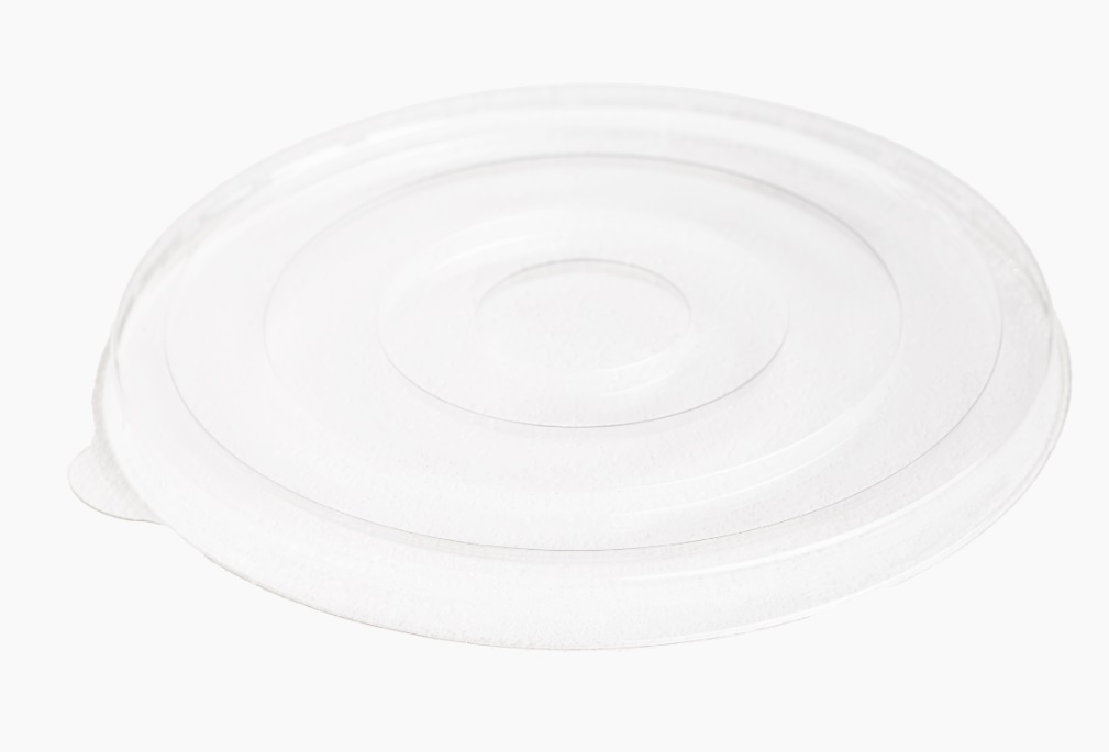 Крышка полипропиленовая плоская на контейнер бумажный Round Bowl объемом 500 мл. Крышки имеют насечки для штабелирования контейнеров друг на друге и надежно держатся на контейнерах.