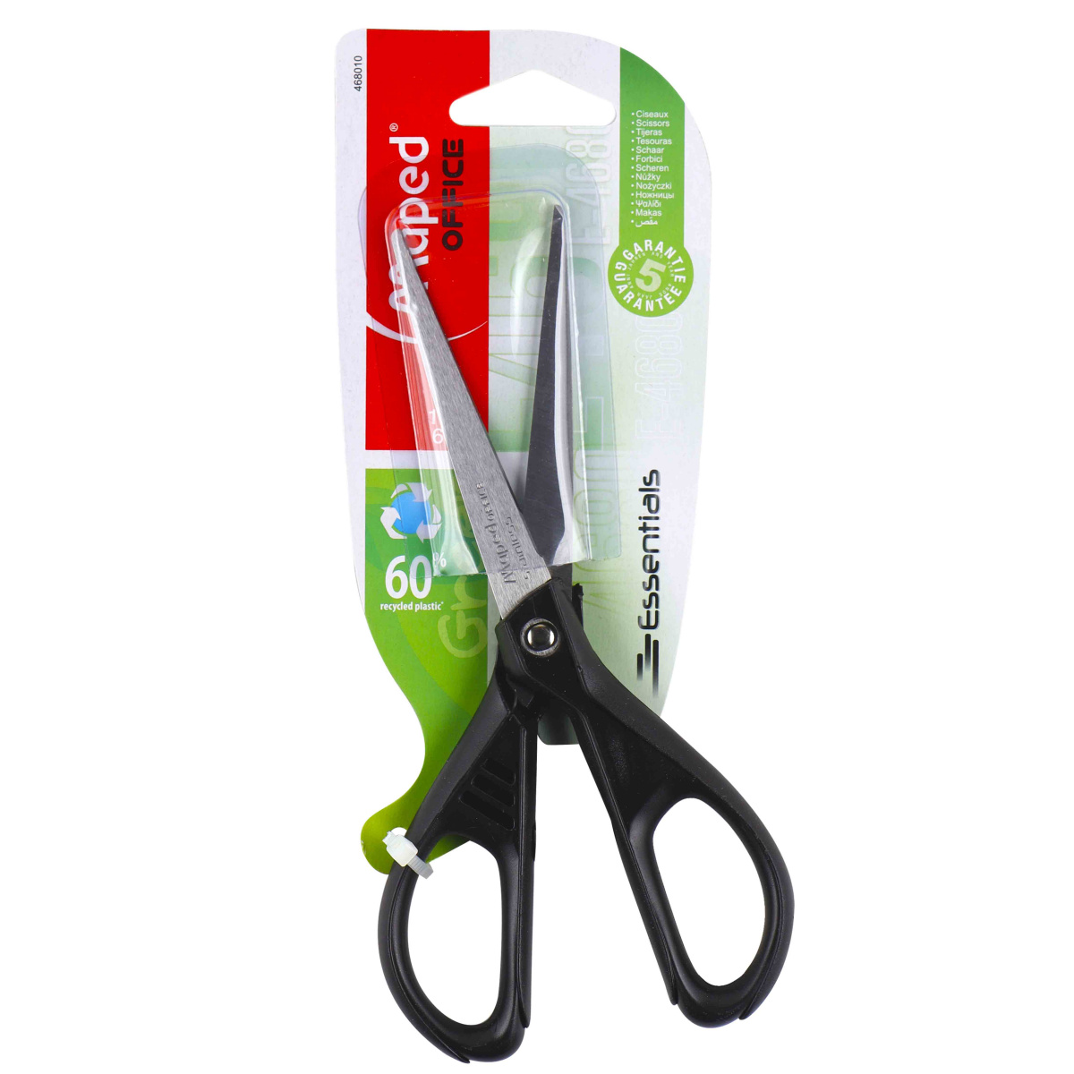 Канцелярские ножницы (офисные) имеют лезвия, выполненные из стали. Ручки выполнены из пластика черного цвета. Двухсторонняя заточка лезвий. Длина ножниц - 210 мм