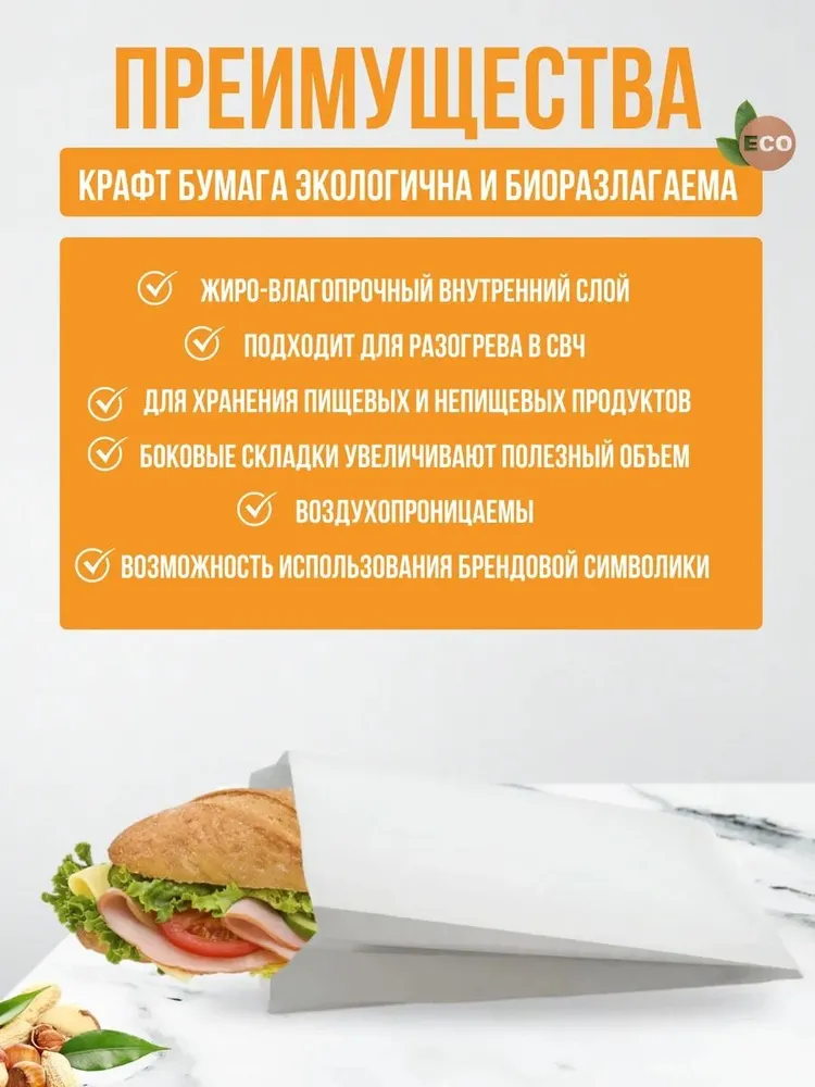 Бумажные пакеты без ручек для экологически безопасной упаковки и хранения пищевых и непищевых продуктов. Используются в торговых сетях, предприятиях общественного и быстрого питания, которые работают на вынос. Пакеты воздухопроницаемы, исключают прение свежей или горячей продукции — хлеба и выпечки, фруктов и зелени, жареных блюд. Боковые складки увеличивают полезный объем.