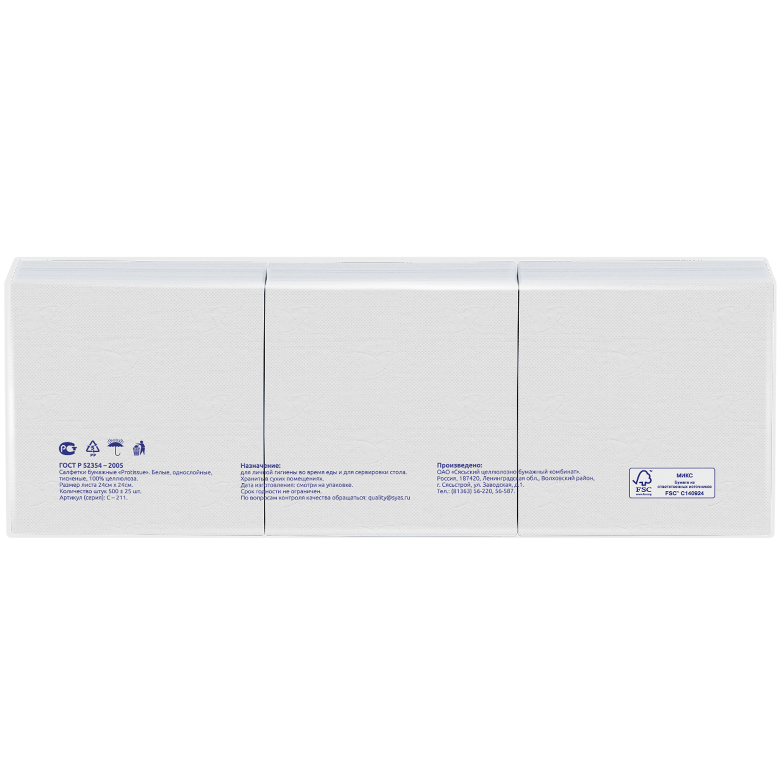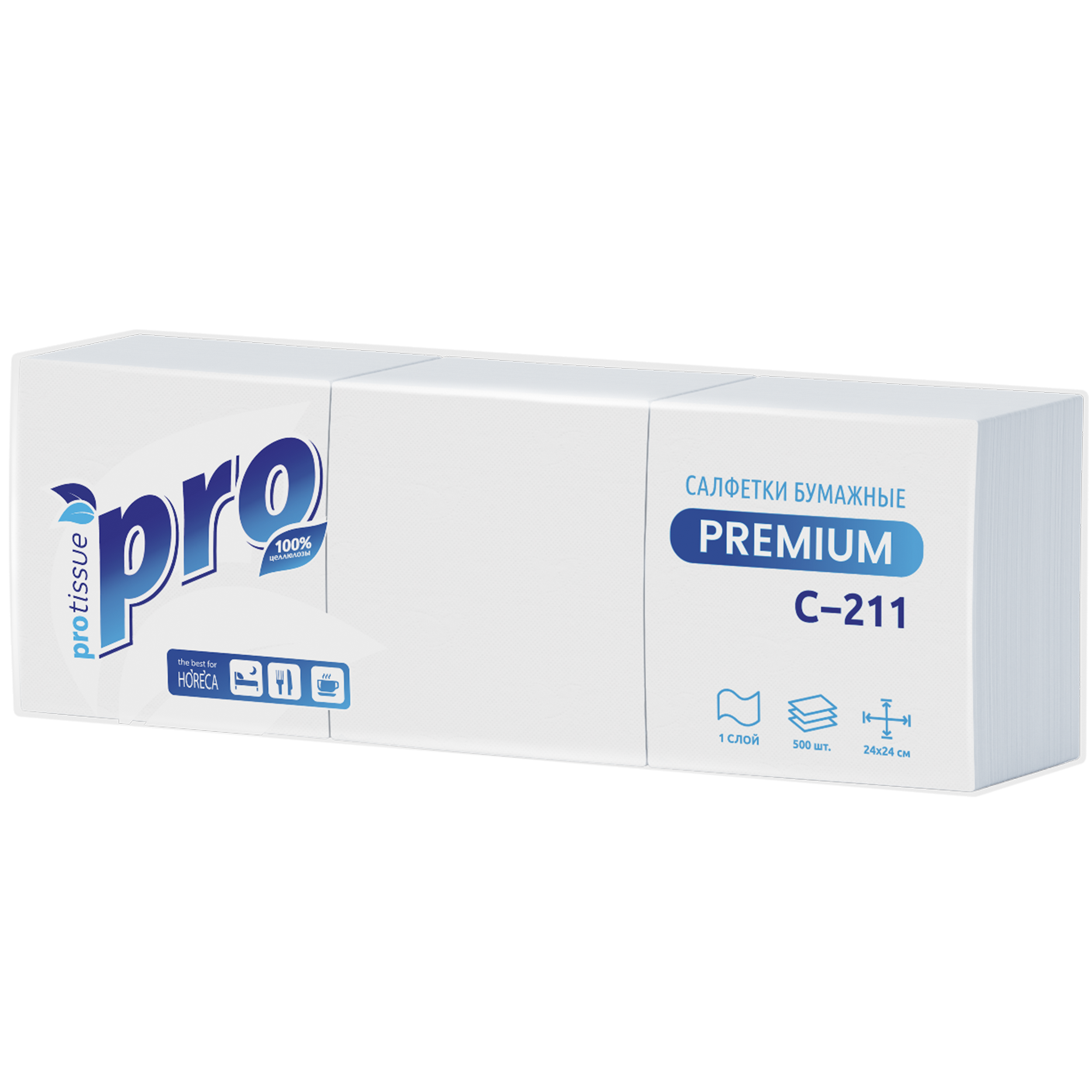 Однослойные салфетки "PROtissue"изготовлены из бумаги со сплошным тиснением. Сложены вчетверо.