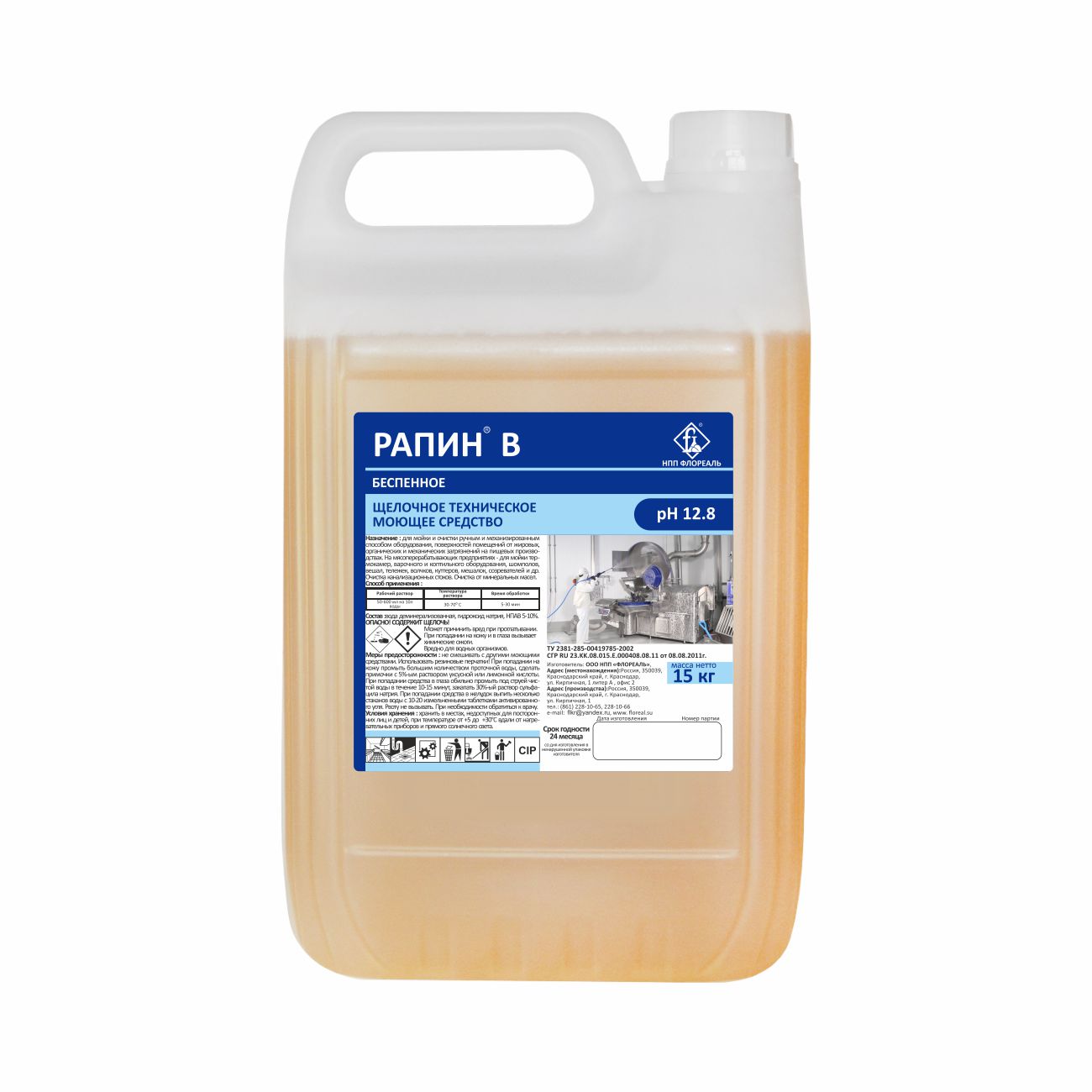 Рапин В – высокощелочной препарат, предназначенный для регулярного мытья наружных и внутренних поверхностей пищевого промышленного оснащения. Жидкость не пенится при нанесении, быстро и полностью смывается, универсальна в применении и экономично расходуется. Она способна без разводов удалить загрязнения, устранить жировые или органические следы на обрабатываемых поверхностях: