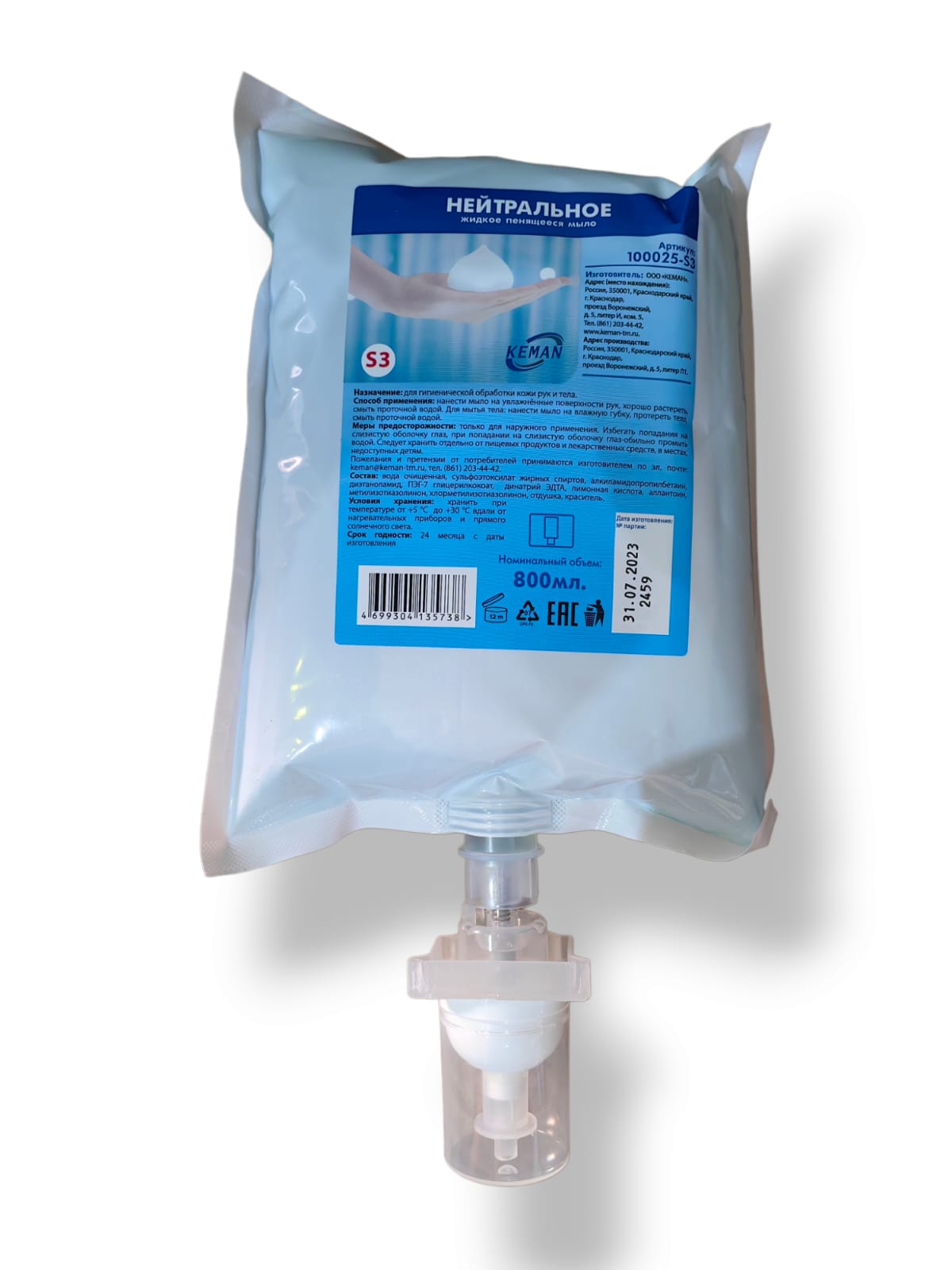 Нейтральное жидкое пенящееся мыло ТМ KEMAN, картридж объем 800 мл. для диспенсеров S3.Одного нажатия достаточно, чтобы хорошенько вымыть руки. Технология вспенивания мыла позволяет значительно сократить расход мыла и экономит ваше время и деньги. Мягкое и деликатное мыло не оставляет подтёков и следов на раковине. Каждый картридж мыла герметично запечатан и снабжён одноразовым дозирующим устройством, что предотвращает риск перекрёстного загрязнения и препятствует попаданию бактерий внутрь картриджа.