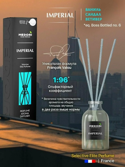IMPERIAL (Аналог Hugo Boss — Boss Bottled no. 6) - Верхние ноты: яблоко, лимон, дубовый мох. Средние ноты: корица, гвоздика (цветок), слива. Базовые ноты: ваниль, сандал, кедр, ветивер.