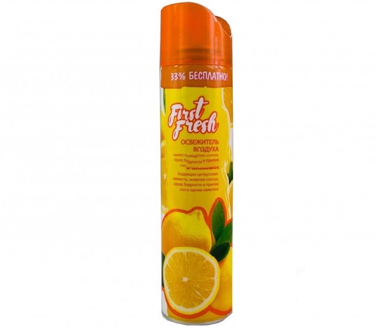 Освежитель воздуха First Fresh «Лимон» предназначен для устранения неприятных запахов в различных помещениях. Обладает длительным действием, надолго наполняя помещение неповторимым тонким ароматом. Не содержит озоноразрушающих веществ.