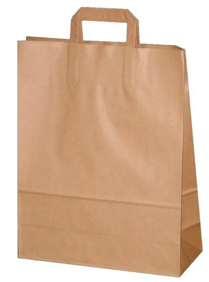 Бумажные пакеты с плоскими ручками подходят для супермаркетов и компаний, предлагающих клиентам готовые продукты питания на вынос. Для изготовления бумажных пакетов «Крафт» с ручками используются экологически чистые возобновляемые материалы.