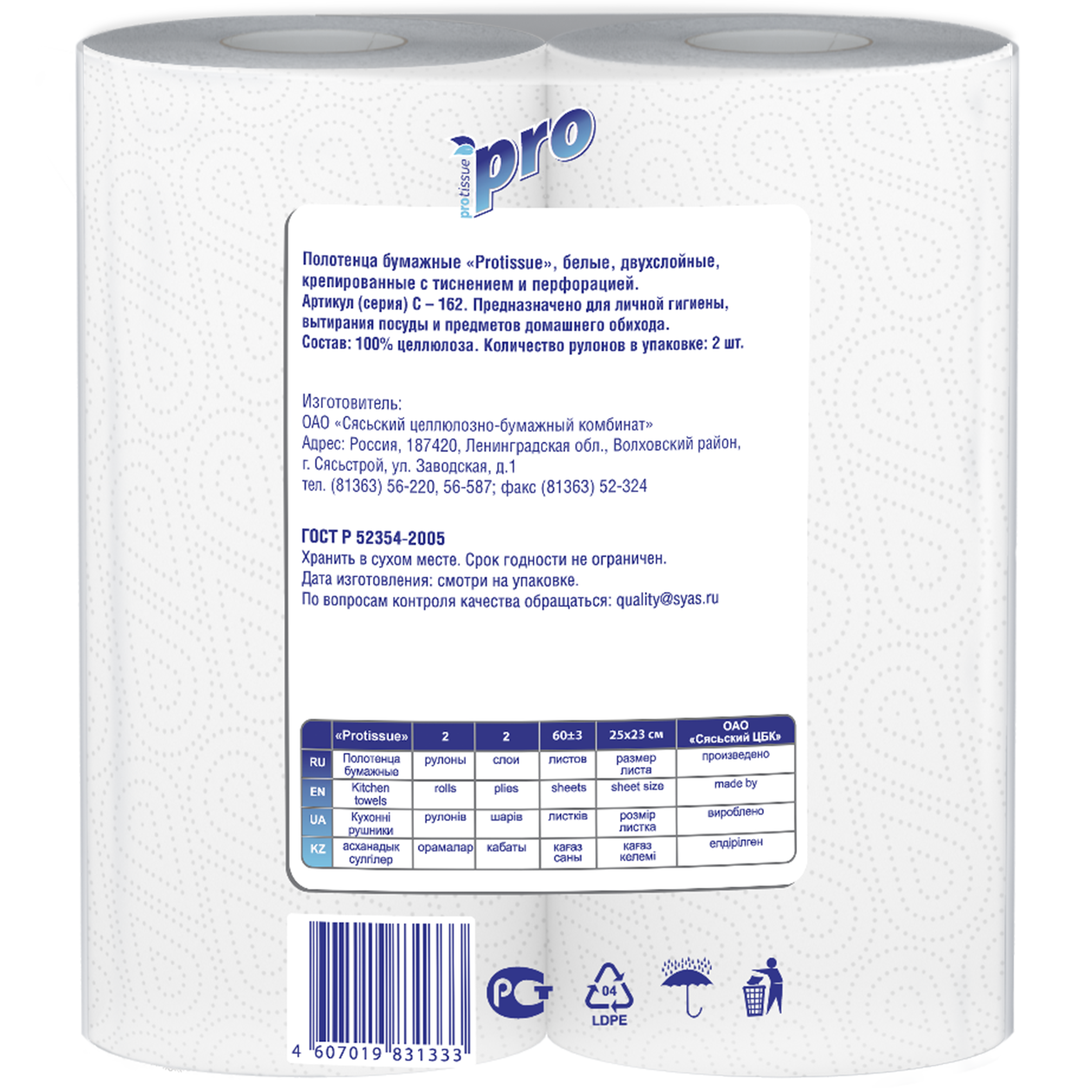 Двухслойные бумажные полотенца крепированные с тиснением и перфорацией. Предназначено для личной гигиены, вытирания посуды и предметов домашнего обихода.