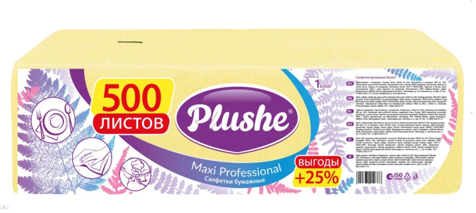 Однослойные салфетки Plushe Maxi Professional изготовлены из бумаги со сплошным тиснением. Сложены вчетверо.