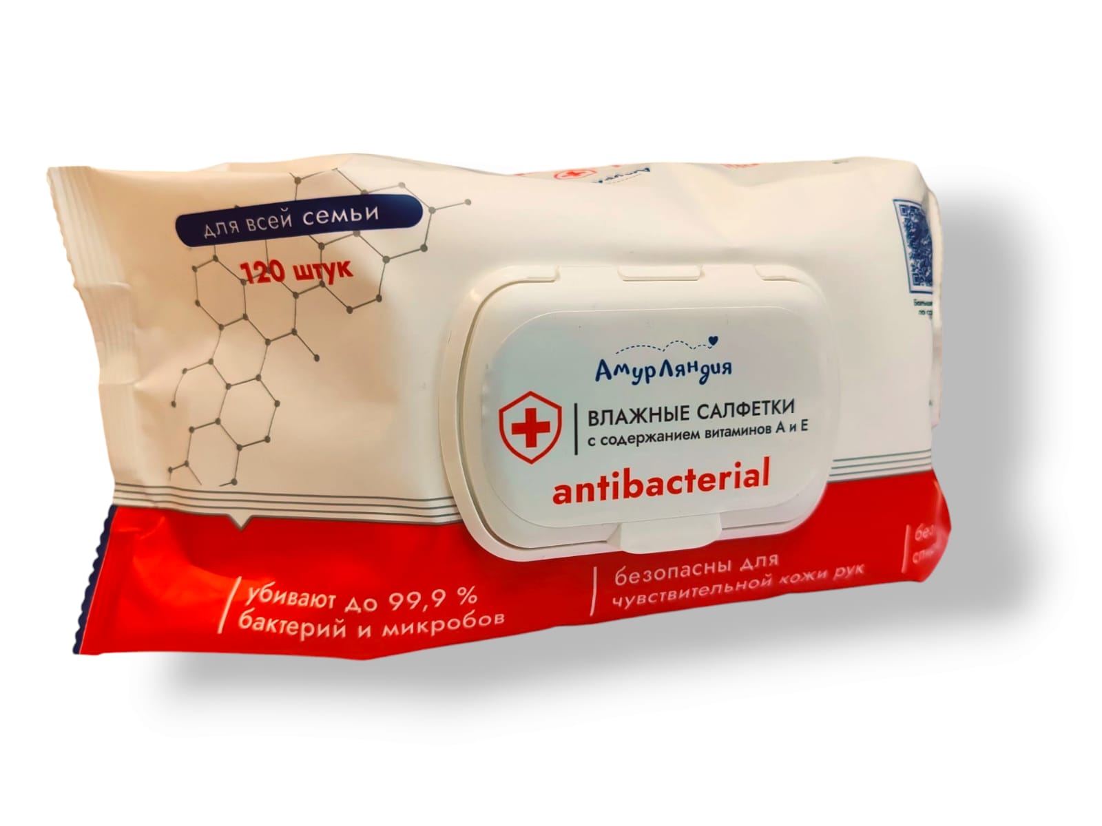 Салфетки влажные АмурЛяндия Антибактериальные, предназначены для ежедневной гигиены кожи рук и тела, а также для обработки разнообразных поверхностей предметов. Обеспечивают надежную долговременную защиту от бактерий и некоторых видов вирусов, обладают увлажняющим эффектом. Содержит витамины А и Е.