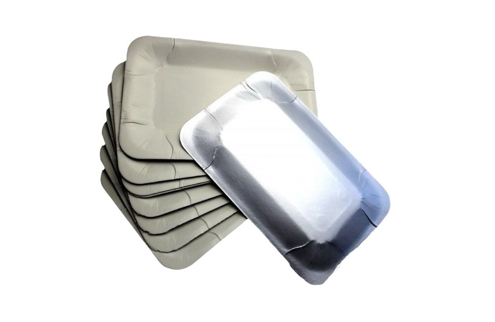 Бумажная одноразовая тарелка прямоугольная с ламинацией с одной стороны и фильгированной поверхностью с другой стороны. Для пищевых продуктов. Не подходит для разогрева в СВЧ-печи.