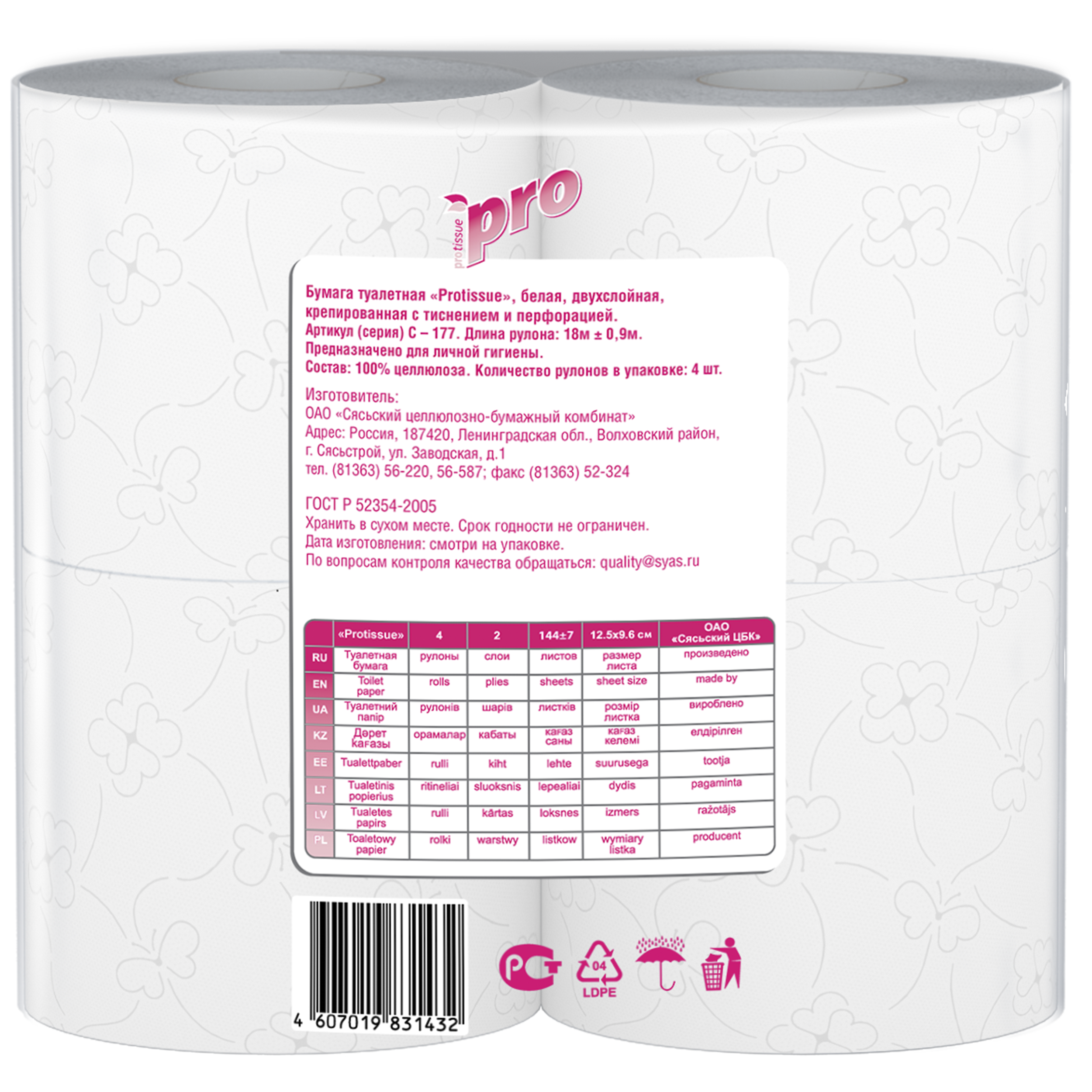 Туалетная бумага изготовлена из экологически чистого натурального сырья с тиснением и перфорацией. Для личной гигиены. Легко отрывается в нужном месте, быстро и без последствий растворяется в воде, не забивая канализационные стоки. Не содержит ароматизаторов.